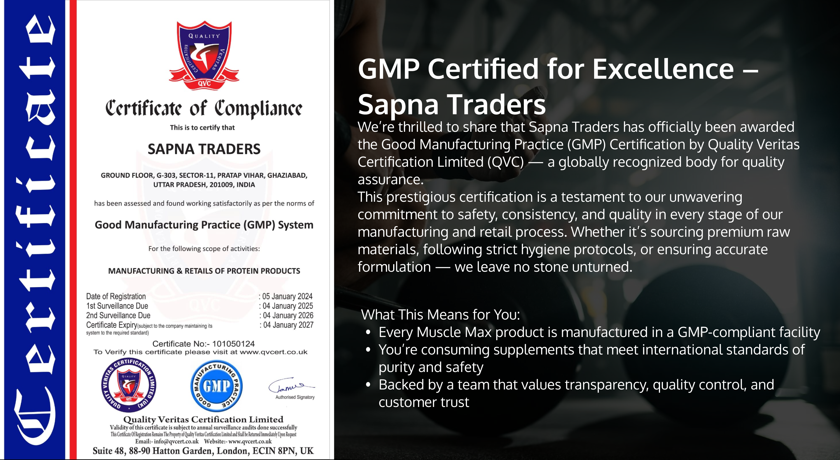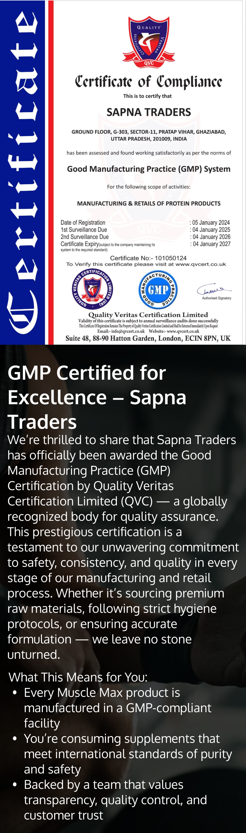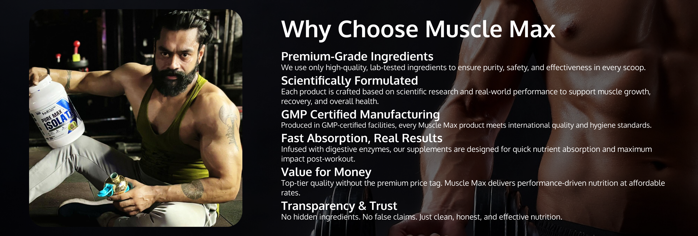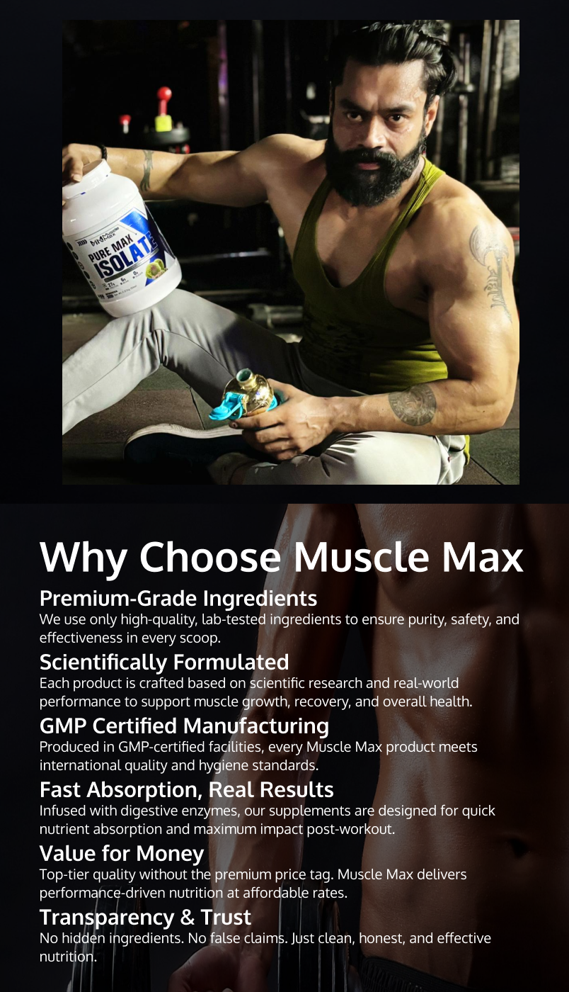 Muscle Max Nutrition Whey Protein is an advanced and powerful supplement designed to support rapid weight gain and lean muscle growth. Formulated to enhance muscle protein synthesis and prevent post-workout muscle breakdown, it ensures optimal recovery and performance. Each serving delivers 25 grams of high-quality protein and 6.2 grams of BCAAs, fueling your body for faster gains. Enriched with digestive enzymes, it promotes efficient nutrient absorption and smooth digestion — helping you get the most out of every scoop.